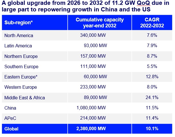 China’s new “Single 30” regulation, coupled with global inflation and supply chain challenges, has impacted offshore economics, leading to project cancelations and postponements, causing the near-term slowdown in growth. However, the new repowering policy in China provides a boost to the long-term global outlook, with annual build from 2026 through 2032 averaging 170 GW per year.